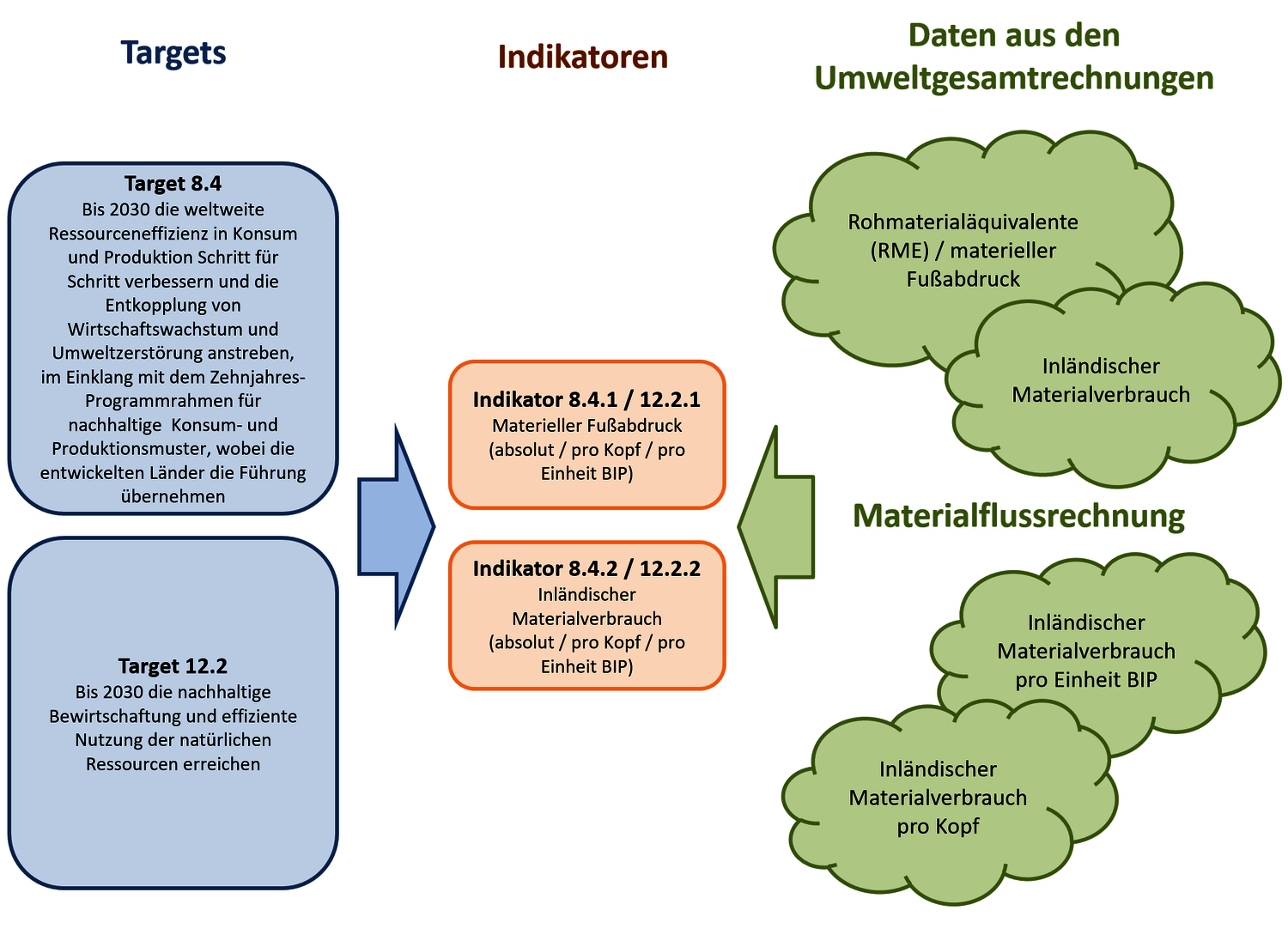 In Österreich ist derzeit ein nationales SDG-Indikatorenset in Verwendung und Weiterentwicklung, wo bereits jetzt UGR-Daten zur Anwendung kommen. Vorrangig geht es dabei um Daten aus der Materialflussrechnung, wie in der nachfolgenden Abbildung zu Ziel 8 (Menschenwürdige Arbeit und Wirtschaftswachstum) ersichtlich ist.